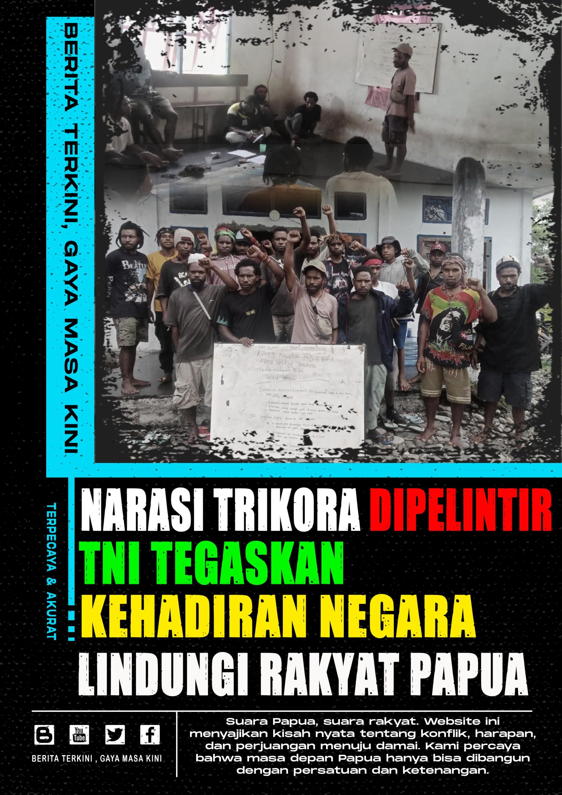 Papua kuat karena rakyatnya bersatu. Papua maju karena menolak pemelintiran sejarah. Papua bersama Indonesia karena damai adalah pilihan.