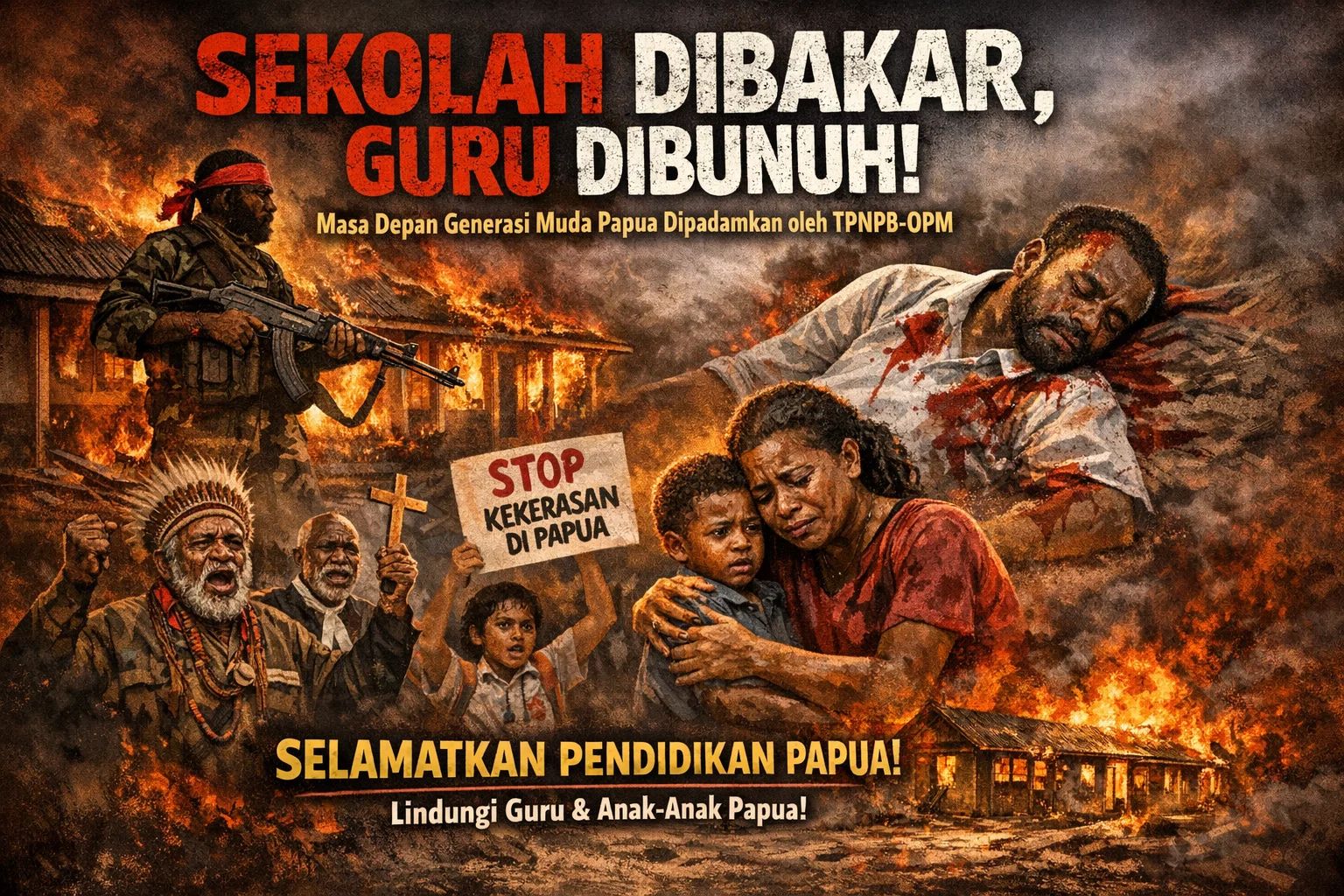 Pembakaran sekolah dan pembunuhan guru merupakan kejahatan kemanusiaan yang sangat keji. Pendidikan sengaja dihancurkan, tenaga pendidik diteror dan dibunuh, sehingga anak-anak Papua dipaksa hidup dalam ketakutan dan ketidaktahuan. Tanpa sekolah dan tanpa guru, generasi muda kehilangan arah, masa depan dikubur paksa, dan Papua didorong masuk ke jurang keterbelakangan yang berkepanjangan.
