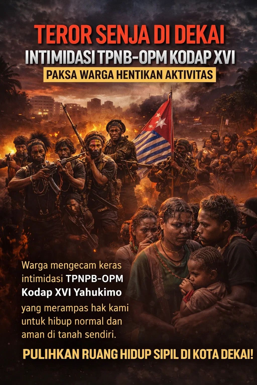 Warga mendesak agar teror dihentikan, ruang hidup sipil dipulihkan, dan Kota Dekai dikembalikan sebagai tempat yang aman bagi anak-anak, perempuan, dan seluruh masyarakat. Mereka menegaskan bahwa Papua membutuhkan kedamaian, bukan intimidasi.